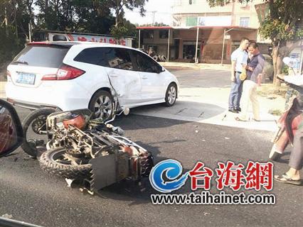 在洪塘路往同安方向的一個(gè)T字形路口,一部白色小車停在路口處,一部摩托車倒在其右后輪下。摩托車前輪輪轂變形嚴(yán)重,小車右后車門(mén)嚴(yán)重變形。