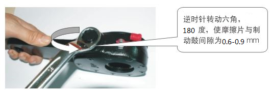 ④調(diào)節(jié)控制臂,用12扳手按順時(shí)針?lè)较蛐D(zhuǎn)六角頭,使摩擦片與制動(dòng)鼓間隙為零。再逆時(shí)針轉(zhuǎn)動(dòng)六角頭3/4圈。完后實(shí)施15次以上制動(dòng),自動(dòng)將間隙調(diào)整臂預(yù)設(shè)間隙。