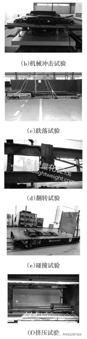 電池包的安全性能測(cè)試包括擠壓、碰撞、短路保護(hù)、濕熱循環(huán)、鹽霧以及外部火燒等多類檢測(cè)項(xiàng)目,但本次優(yōu)化設(shè)計(jì)僅對(duì)電池包不同結(jié)構(gòu)件的材料、厚度或幾何特征進(jìn)行了變更,并未改變電池包內(nèi)部的電氣電路、溫控系統(tǒng)和各結(jié)構(gòu)件之間的連接關(guān)系,因此,只進(jìn)行與電池包結(jié)構(gòu)性能要求相關(guān)的幾類測(cè)試,如圖9所示。