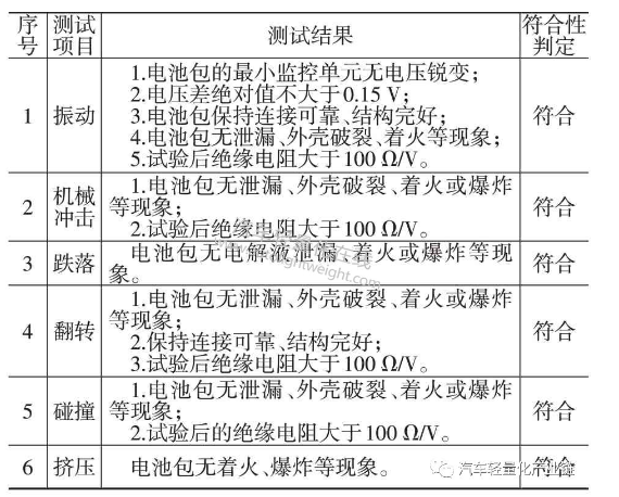 由檢測(cè)結(jié)果可知,優(yōu)化后的電池包實(shí)體在6項(xiàng)檢測(cè)中未出現(xiàn)起火、爆炸、電解液泄漏以及短路等問(wèn)題,各項(xiàng)安全性能指標(biāo)均滿足國(guó)家標(biāo)準(zhǔn)要求。試驗(yàn)結(jié)果表明,優(yōu)化后的電池包仍具有良好的安全性能,該優(yōu)化設(shè)計(jì)方案可行。