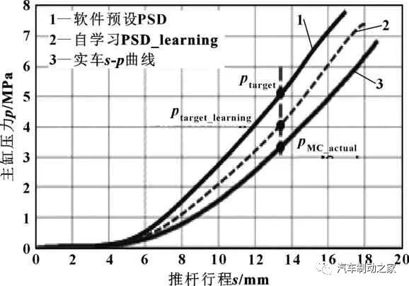 由協(xié)調式再生制動的工作原理以及電控制動助力的力學平衡方程可知,在制動能量回收的工況下,由于ESC將輪缸液量儲存入低壓蓄能器,電控制動助力器主缸的液壓反作用力Fhydraulic將下降,需實時控制踏板推桿與閥體的相對位移大小,以平衡駕駛員制動踏板力,保證制動能量回收時良好的踏板感覺一致性。制動踏板感覺依賴于制動系統(tǒng)p-V曲線,其中p為制動系統(tǒng)壓力,V為制動液流量,如圖4所示,p-V曲線可以轉化為推桿行程壓力曲線s-p曲線,如圖5所示,其中s為輸入推桿行程,p為制動系統(tǒng)壓力,以s-p曲線作為控制目標。再生制動工況過程中,根據s-p曲線計算一定推桿行程下虛擬的主缸壓力。以輸入推桿行程s=a為例說明,即駕駛員意圖的主缸壓力SPD(SP Demand)=pa0,進而得到整車所需的總的制動力矩。以再生制動力矩可以換算為pa2,那么實際液壓則對應于pa0-pa2,此部分液壓由ESC進行調節(jié)控制。當車輛制動踏板感覺BFI曲線設定之后,如圖6,BFI曲線包含了3組關系:踏板行程-減速度曲線,踏板力-減速度曲線,踏板力-踏板行程曲線;一定的制動系統(tǒng),踏板行程-踏板減速度根據s-p曲線為確定的關系,那么踏板力是可調參數(shù),設定了一組BFI1踏板力-踏板減速度曲線之后,那么踏板力和踏板行程關系則確定;通過調節(jié)不同減速度下對應的踏板力,可以得到不同的踏板力和踏板行程關系,如圖6中BFI2所示。以駕駛員的踏板推桿行程為輸入,基于PID控制的制動助力控制,實現(xiàn)制動踏板感控制,具體的協(xié)調式再生制動制動踏板感控制算法如圖7所示。由于實際的制動系統(tǒng)不同車輛之間p-V曲線一致性存在一定帶寬,并且同一輛車不同工況比如溫度不同,高速低速轉彎工況,卡鉗Cp值變化導致轉換的不同推桿行程對應的主缸壓力變化。由于再生制動工況,其摩擦制動液壓力計算來源于s-p曲線,為了確保有再生制動和無再生制動BFI線性度和一致性,需要獲取當前車輛準確的s-p曲線。為了獲取準確的s-p曲線,需要在低車速純摩擦制動工況下,根據主缸壓力傳感器得到的主缸壓力pMC_actual以及推桿行程傳感器獲取的推桿行程sactual進行迭代計算學習,得到SPD學習系數(shù)??刂扑惴ㄖ?,SPD學習是根據不同車輛的實際制動系統(tǒng)建壓能力大小,不斷地將軟件內部預設的液量與壓力的相關曲線進行自學習,以靠近實際車輛的液量與壓力的曲線,具體學習過程如圖8所示。ESC在檢測到實際車輛的踏板行程與壓力的關系曲線與軟件內預設的曲線不一致時,會在純液壓制動工況下,選取3個不同推桿行程對應的點,通過如下算法將踏板行程壓力曲線不斷往實車曲線靠近,每個點選取40個pMC_actualy壓力值的平均值進行迭代。